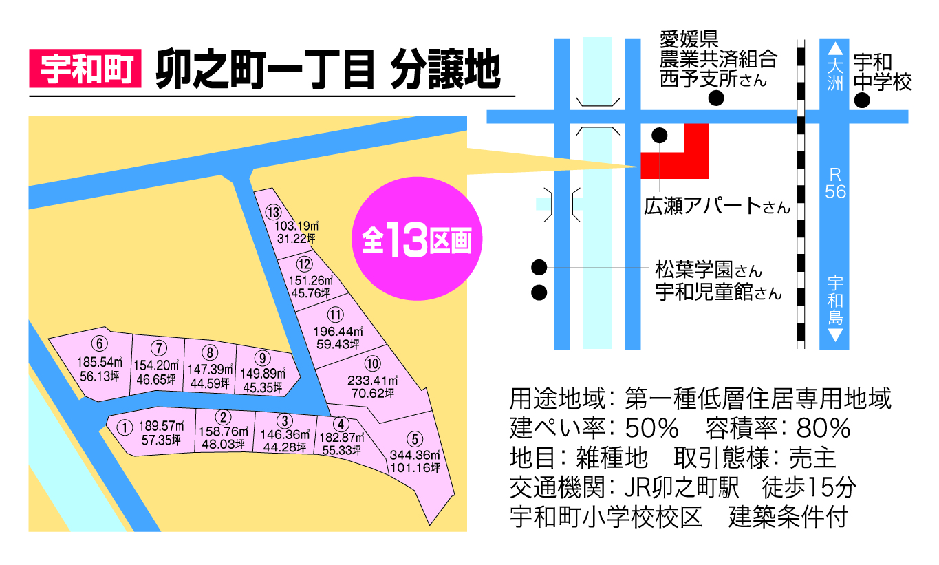 用途地域:第一種中高層住宅専用地 建ぺい率;60% 容積率 ;200% 地目 ;宅地 取引形態;売主交通機関;宇和島自動車卯之町駅 徒歩10 JR卯之町駅 徒歩15分宇和町小学校校区建築条件付① 番地;西予市宇和町卯之町三丁目84-2 地籍;233.32㎡(70.58坪) 価格:13.5万円/坪 9.528.000円 ②番地;西予市宇和町卯之町三丁目84-3 地籍;225.76㎡(68.29坪)価格:13.5万円/坪 9.219.000円