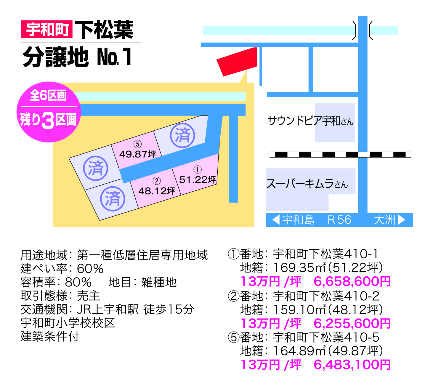用途地域:第一種低層住居専用地域 建ぺい率;60% 容積率 ;80% 地目 ;雑種地取引形態;売主交通機関;JR上宇和駅 徒歩15分宇和町小学校校区建築条件付全3区画① 番地;西予市宇和町下松葉410-1 地籍;169.35㎡(51.22坪) 価格:13万円/坪 6.658.600円② 番地;西予市宇和町下松葉410-2 地籍;159.10㎡(48.12坪) 価格:13万円/坪 6.255.600円 ⑤ 番地;西予市宇和町下松葉410-5 地籍;164.89㎡(49.87坪) 価格:13万円/坪 6.483.100円⑥モデル住宅完売いたしました。